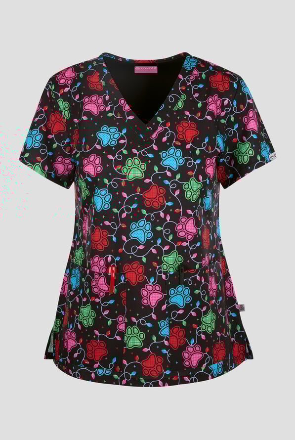 Der Zavate Ava Therese Pawfect Lights Kasack bringt Farbe in deinen Arbeitsalltag! Das verspielte Design mit bunten Lichterketten und kleinen Pfotenmotiven auf schwarzem Hintergrund sorgt sofort für weihnachtliche Stimmung.